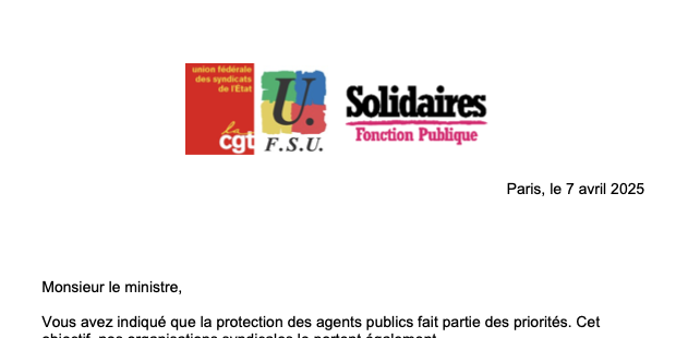 Il vous appartient, en tant que ministre de l’ensemble des agentes et agents de la fonction publique, de dénoncer fermement l’ensemble des actes, y compris symboliques, visant des agentes et agents publics dans le cadre de leurs fonctions ou dans leur vie personnelle du fait de leurs fonctions.