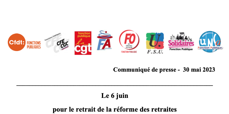 Les fédérations syndicales de la fonction publique appellent les personnels à se mobiliser massivement, par la grève et les manifestions le mardi 6 juin prochain pour réaffirmer le rejet de la réforme des retraites imposée par le gouvernement, et pour une augmentation immédiate des salaires et l’ouverture de réelles négociations sur l’amélioration des carrières et des rémunérations.