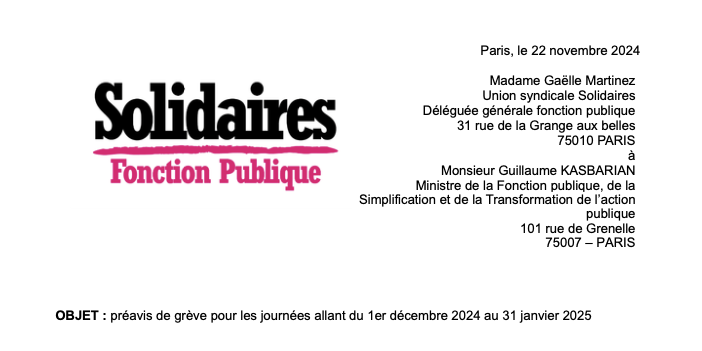 L’Union syndicale Solidaires Fonction publique dépose un préavis de grève pour les journées allant du 1er décembre 2024 au 31 janvier 2025 (de 0 h à 24 h).