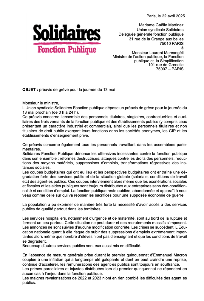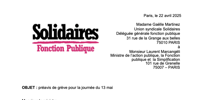 L’Union syndicale Solidaires Fonction publique dépose un préavis de grève pour la journée du 13 mai prochain (de 0 h à 24 h).