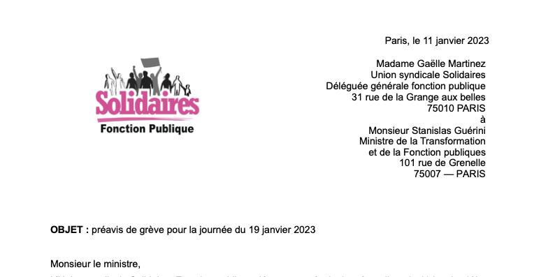 L’Union syndicale Solidaires Fonction publique dépose un préavis de grève allant du 18 janvier 19h au 20 janvier 8h.