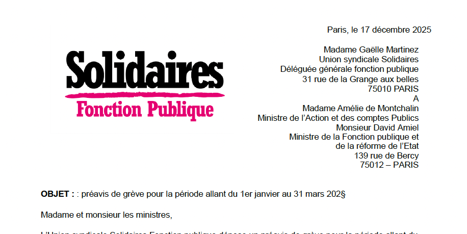 L’Union syndicale Solidaires Fonction publique dépose un préavis de grève pour la période allant du 1er janvier au 31 mars 2026 (de 0 h à 24 h).