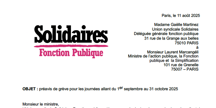 L’Union syndicale Solidaires Fonction publique dépose un préavis de grève pour les journées allant du 1er septembre 2025 au 31 octobre 2025 (de 0 h à 24 h).