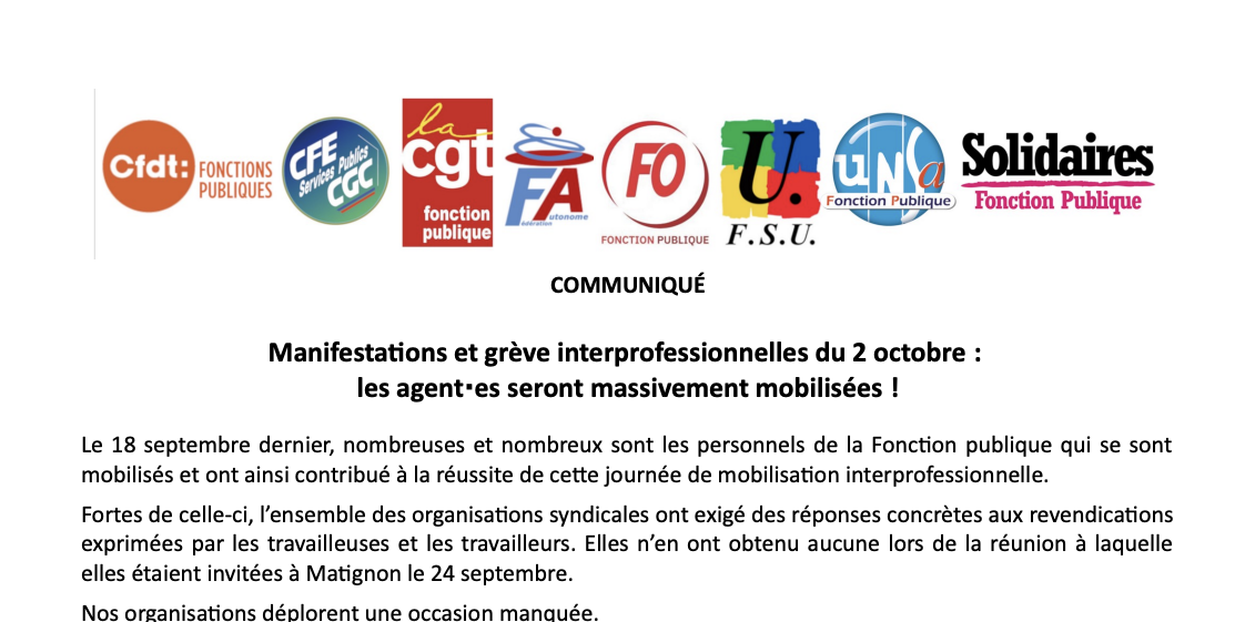 Les organisations syndicales de la fonction publique appellent les personnels à se mobiliser encore plus fortement lors d’une nouvelle journée interprofessionnelle de grève et de manifestation le jeudi 2 octobre prochain.