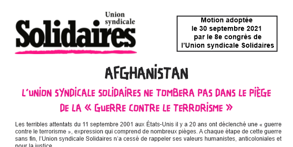 Nous nous opposons avec la Marche Mondiale des Femmes à « toutes les formes de violence et d’actes terroristes commis dans le monde, ce qui inclut les pratiques des pays telles que les guerres dites humanitaires ou de basse intensité, leurs attaques contre la démocratie et la souveraineté des peuples, les blocus économiques, les occupations colonialistes, les politiques sionistes, l’oppression raciste et patriarcale. Nous savons par expérience que ce sont les femmes et les enfants qui sont les premières victimes, avec les populations pauvres et les communautés racisées, de tout conflit armé. Nous avons connu les conséquences des interventions militaires des forces de l’OTAN et aujourd’hui, le désengagement irresponsable des troupes américaines montre que le peuple afghan vit dans une terrible pauvreté. » (3)