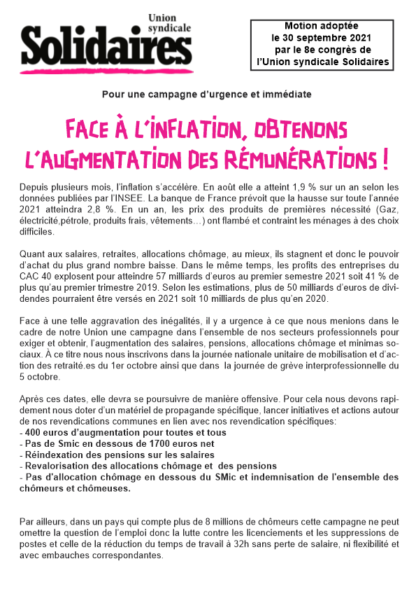 Face à une telle aggravation des inégalités, il y a urgence à ce que nous menions dans le cadre de notre Union une campagne dans l’ensemble de nos secteurs professionnels pour exiger et obtenir, l’augmentation des salaires, pensions, allocations chômage et minimas sociaux. À ce titre nous nous inscrivons dans la journée nationale unitaire de mobilisation et d’action des retraité.es du 1er octobre ainsi que dans la journée de grève interprofessionnelle du 5 octobre.