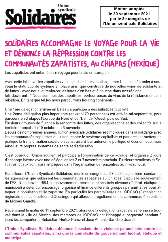 Par ailleurs, L'Union Syndicale Solidaires, réunie en congrès du 27 au 30 septembre, condamne les agressions que subissent les communautés zapatistes au Chiapas. Depuis le soulèvement de l'EZLN en janvier 1994, le gouvernement mexicain et ses trois niveaux (fédéral, étatique et municipal) a défendu, encouragé, organisé et financé différents groupes paramilitaires pour attaquer la population civile zapatiste.