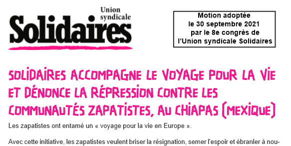 Par ailleurs, L'Union Syndicale Solidaires, réunie en congrès du 27 au 30 septembre, condamne les agressions que subissent les communautés zapatistes au Chiapas. Depuis le soulèvement de l'EZLN en janvier 1994, le gouvernement mexicain et ses trois niveaux (fédéral, étatique et municipal) a défendu, encouragé, organisé et financé différents groupes paramilitaires pour attaquer la population civile zapatiste.