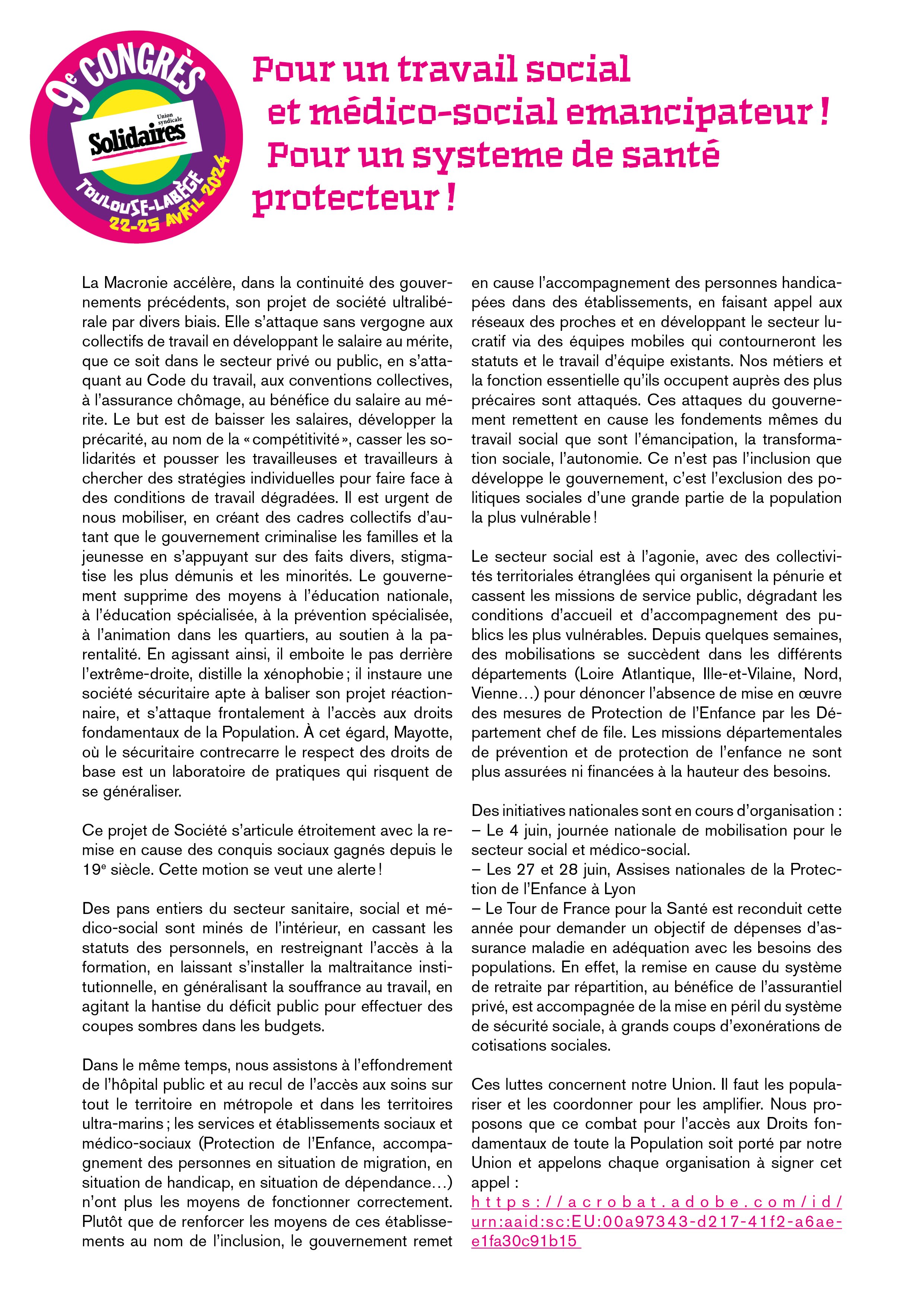 Ces luttes concernent notre Union. Il faut les populariser et les coordonner pour les amplifier. Nous proposons que ce combat pour l’accès aux Droits fondamentaux de toute la Population soit porté par notre Union et appelons chaque organisation à signer cet appel :
