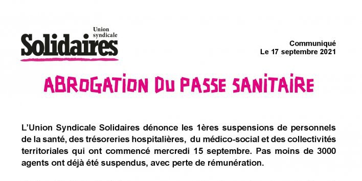 L’Union Syndicale Solidaires dénonce les 1ères suspensions de personnels de la santé, des trésoreries hospitalières, du médico-social et des collectivités territoriales qui ont commencé mercredi 15 septembre. Pas moins de 3000 agents ont déjà été suspendus, avec perte de rémunération.