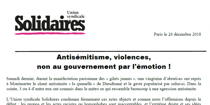 Samedi dernier, durant la manifestation parisienne des « gilets jaunes », une vingtaine d’abruti-es ont repris à Montmartre le chant antisémite « la quenelle » de Dieudonné et le geste popularisé par celui-ci. Dans la soirée, 3 ou 4 d’entre eux ont commis dans le métro ce qui ressemble beaucoup à une agression antisémite.