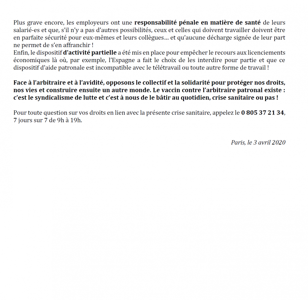 a été mis en place pour empêcher le recours aux licenciements économiques là où, par exemple, l’Espagne a fait le choix de les interdire pour partie et que ce dispositif d’aide patronale est incompatible avec le télétravail ou toute autre forme de travail !Face à l’arbitraire et à l’avidité, opposons le collectif et la solidarité pour protéger nos droits, nos vies et construire ensuite un autre monde. Le vaccin contre l’arbitraire patronal existe : c’est le syndicalisme de lutte et c’est à nous de le bâtir au quotidien, crise sanitaire ou pas !
