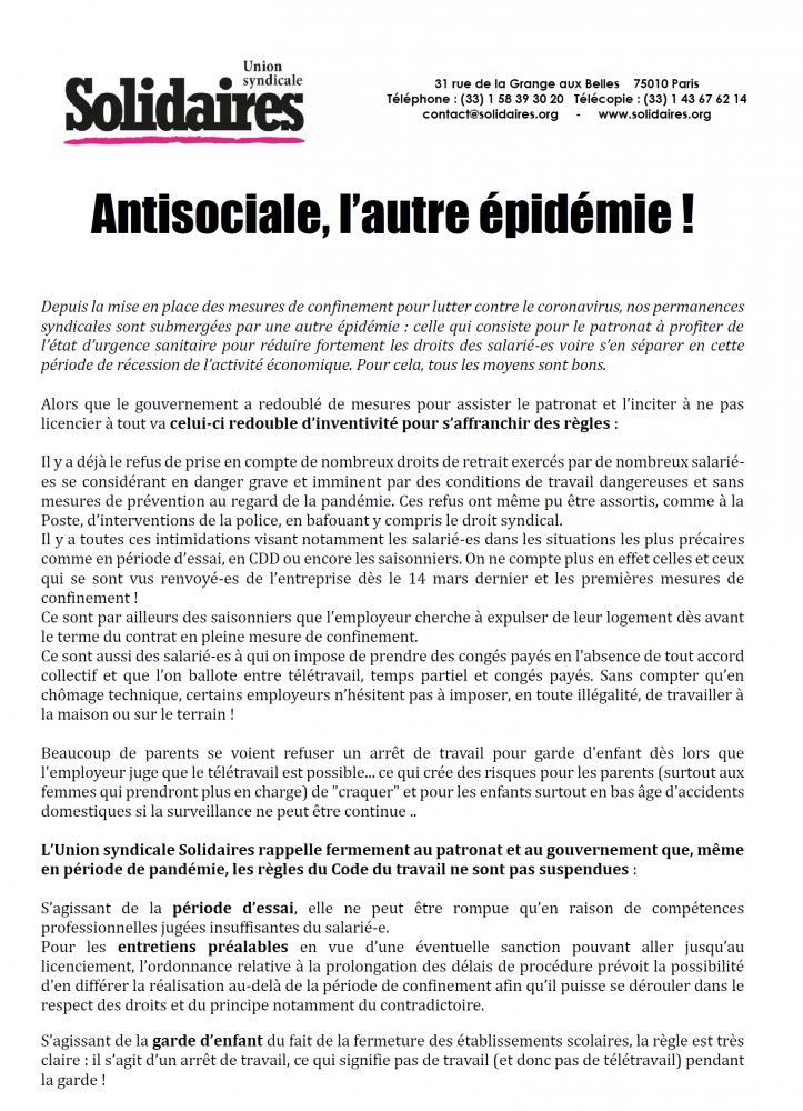 L’Union syndicale Solidaires rappelle fermement au patronat et au gouvernement que, même en période de pandémie, les règles du Code du travail ne sont pas suspendues :