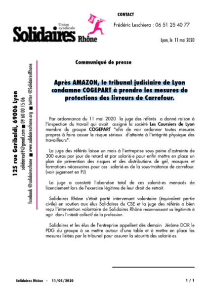 Après AMAZON, le tribunal judiciaire de Lyon condamne COGEPART à prendre les mesures de protections des livreurs de Carrefour