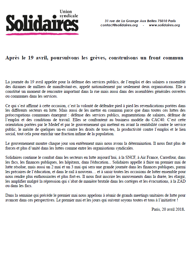 Solidaires continue le combat dans les secteurs en lutte aujourd’hui, à la SNCF, à Air France, Carrefour, dans les facs, les finances publiques, les hôpitaux, dans l'éducation... Solidaires appelle à faire un premier mai de lutte résolue, mais aussi un 2 mai et un 3 mai qui sera une grande journée dans les finances publiques, parmi les précaires de l’éducation, et dans le rail à nouveau… et à saisir toutes les occasions de lutter ensemble pour nous rendre plus enthousiastes et plus fort-es. Il nous faut inscrire les mouvements dans la durée, les élargir, les amplifier malgré la répression qui s’abat de manière brutale dans les cortèges et les évacuations, à la ZAD ou dans les facs.