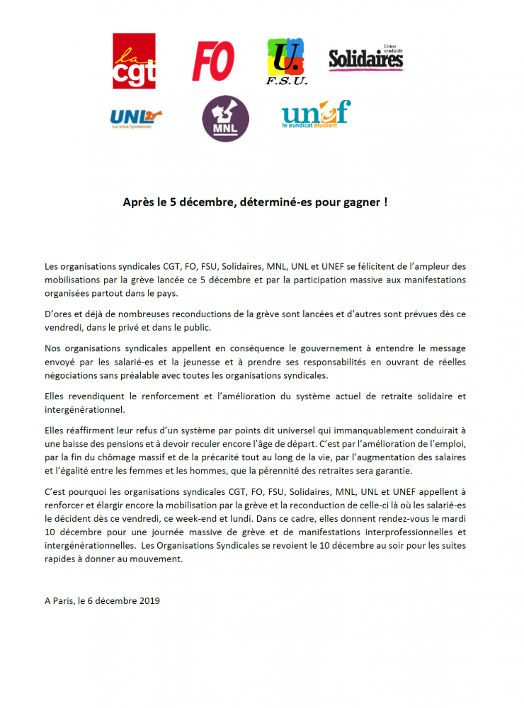 Les organisations syndicales CGT, FO, FSU, Solidaires, MNL, UNL et UNEF se félicitent de l’ampleur des mobilisations par la grève lancée ce 5 décembre et par la participation massive aux manifestations organisées partout dans le pays.