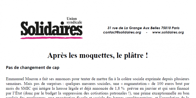 Emmanuel Macron a fait ses annonces pour tenter de mettre fin à la colère sociale exprimée depuis plusieurs semaines. Mais pas de surprises : quelques mesures sociales, une « augmentation » de 100 euros brut par mois du SMIC qui intègre la hausse légale et déjà annoncée de 1,8 % prévue en janvier et qui sera financé par l’État (donc par le budget la suppression des cotisations patronales !), une prime exceptionnelle au bon vouloir des employeurs, une exonération fiscale et sociale des heures supplémentaires, et l’annulation de la hausse de la CSG pour 2019 pour les retraité-es qui gagnent moins de 2000 euros.