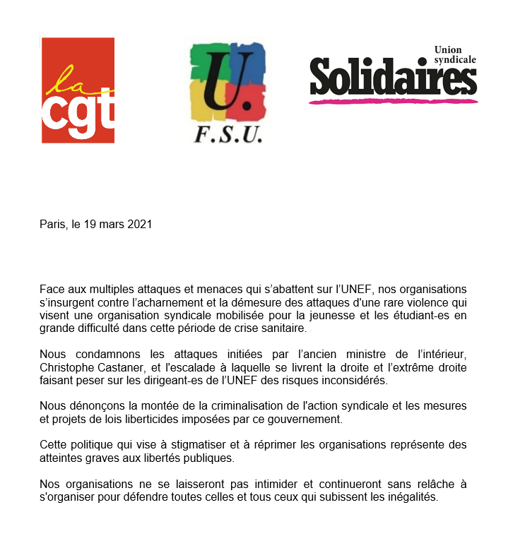Face aux multiples attaques et menaces qui s’abattent sur l’UNEF, nos organisations s’insurgent contre l’acharnement et la démesure des attaques d'une rare violence qui visent une organisation syndicale mobilisée pour la jeunesse et les étudiant-es en grande difficulté dans cette période de crise sanitaire.
