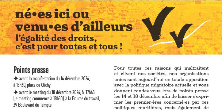 Pour toutes ces raisons qui maltraitent et clivent nos sociétés, nos organisations unies sont aujourd’hui en totale opposition avec la politique migratoire actuelle et vous donnent rendez-vous lors de points presse les 14 et 18 décembre afin de laisser s'exprimer les premier-ères concerné-es par ces politiques mortifères, mais également de nous permettre de déconstruire les discours mensongers visant à faire peur à la population, de dénoncer les mesures du pacte européen qui reprend notamment la pratique française des zones d'attente et de montrer qu’une autre politique est possible en France comme c’est le cas en Espagne.