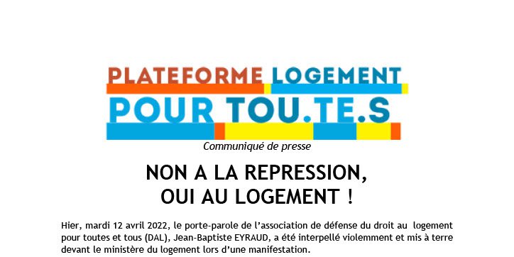 Hier, mardi 12 avril 2022, le porte-parole de l’association de défense du droit au logement pour toutes et tous (DAL), Jean-Baptiste EYRAUD, a été interpellé violemment et mis à terre devant le ministère du logement lors d’une manifestation.