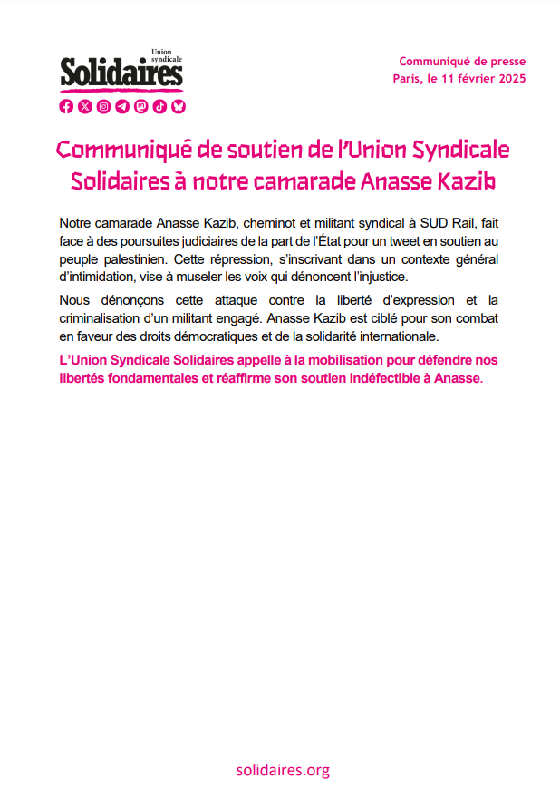 Notre camarade Anasse Kazib, cheminot et militant syndical à SUD Rail, fait face à des poursuites judiciaires de la part de l’État pour un tweet en soutien au peuple palestinien. Cette répression, s’inscrivant dans un contexte général d’intimidation, vise à museler les voix qui dénoncent l’injustice.