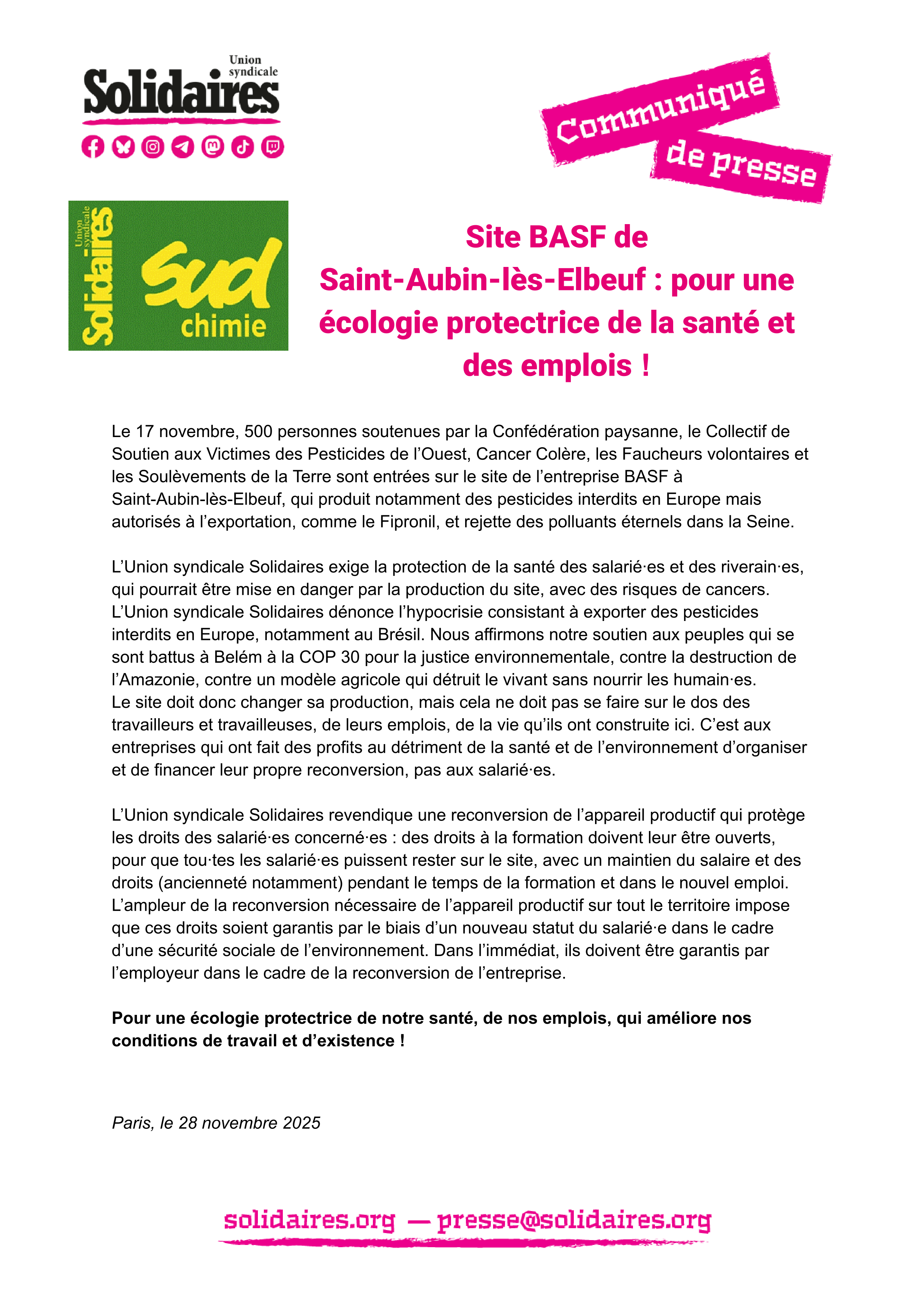 Le 17 novembre, 500 personnes soutenues par la Confédération paysanne, le Collectif de Soutien aux Victimes des Pesticides de l’Ouest, Cancer Colère, les Faucheurs volontaires et les Soulèvements de la Terre sont entrées sur le site de l’entreprise BASF à Saint-Aubin-lès-Elbeuf, qui produit notamment des pesticides interdits en Europe mais autorisés à l’exportation, comme le Fipronil, et rejette des polluants éternels dans la Seine.