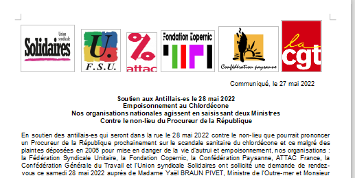 En soutien des antillais-es qui seront dans la rue le 28 mai 2022 contre le non-lieu que pourrait prononcer un Procureur de la République prochainement sur le scandale sanitaire du chlordécone et ce malgré des plaintes déposées en 2006 pour mise en danger de la vie d'autrui et empoisonnement, nos organisations : la Fédération Syndicale Unitaire, la Fondation Copernic, la Confédération Paysanne, ATTAC France, la Confédération Générale du Travail et l’Union syndicale Solidaires ont sollicité une demande de rendez-vous ce samedi 28 mai 2022 auprès de Madame Yaël BRAUN PIVET, Ministre de l’Outre-mer et Monsieur DUPONT MORETTI, Ministre de la Justice, Garde des Sceaux.