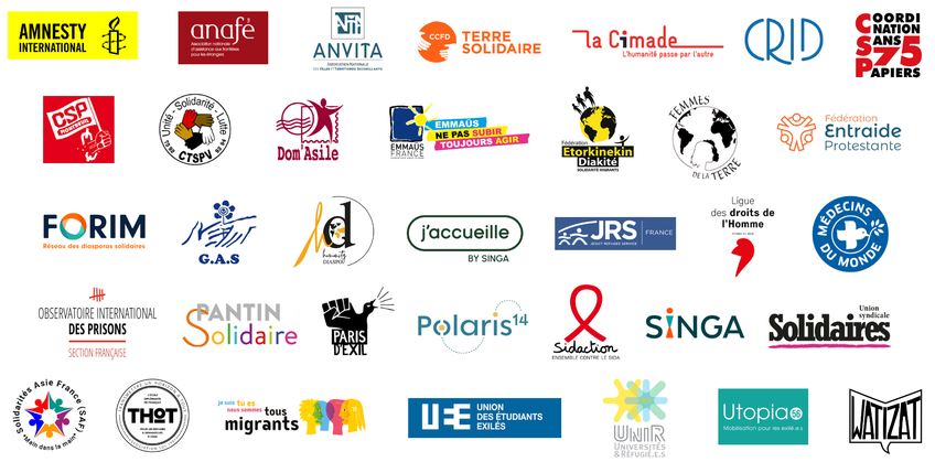 Amnesty International France, Anafé, Association nationale des villes et territoires accueillants (ANVITA), CCFD-Terre Solidaire, La Cimade, CRID, Coordination 75 des Sans Papiers (CSP 75), Collectif des Sans papiers de Montreuil (CSPM), Collectif des travailleurs sans papiers de Vitry-sur-Seine (CTSPV), Dom’asile, Emmaüs France, Fédération Etorkinekin Diakité, Femmes de la Terre, Fédération de l’Entraide Protestante (FEP), FORIM, Groupe Accueil et Solidarité (GAS), Humanity Diaspo, J'accueille, JRS France, Ligue des droits de l'Homme (LDH), Médecins du Monde, Observatoire International des Prisons - section française, Pantin Solidaire, Paris d'Exil, Polaris 14, Sidaction, SINGA, Union Syndicale Solidaires, Solidarités Asie France (SAF), Thot, Tous migrants, Union des Étudiants Exilés (UEE), UniR, Utopia 56, Watizat.