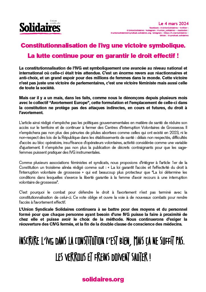 L’Union Syndicale Solidaires continuera à se battre pour des moyens et du personnel formé pour que chaque personne ayant besoin d’une IVG puisse la faire à proximité de chez elle et puisse avoir le choix de la méthode. Nous continuerons d’exiger la réouverture des CIVG fermés, et la fin de la double clause de conscience des médecins.
