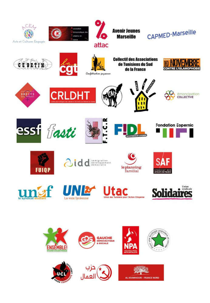 Arts et Cultures Engagés du Monde (ACEM) ; Association Démocratique des Tunisiens en France (ADTF) ; ATTAC ; Avenir Jeunes Marseille ; Cap-Med-Marseille ; Centre d’Etudes et d’Initiatives de Solidarité Internationale (CEDETIM) ; CGT ; Collectif des Associations de Tunisiens du Sud de la France - ATSF ; Collectif du 10 novembre contre l’islamophobie ; Collectif National pour les Droits des Femmes ; Comité pour le Respect des Libertés et des Droits de l’Homme en Tunisie (CRLDHT) ; Confédération Nationale du Travail (CNT) ; Confédération Paysanne ; DAL (Droit Au Logement) ; Emancipation Collective ; Europe solidaire sans frontières (ESSF) ; FASTI (Fédération des Associations de Solidarité avec Tou-te-s les Immigré-e-s) ; Fédération des Tunisiens pour une Citoyenneté des deux Rives (FTCR) ; FIDL ; Fondation Copernic ; Front Uni des Immigrations et des Quartiers Populaires (FUIQP) ; Immigration Développement Démocratie (IDD) ; Planning familial ; Syndicat des Avocats de France ; UNEF ; UNL ; Union des Tunisiens pour l’Action Citoyenne (UTAC) ; Union syndicale Solidaires.
