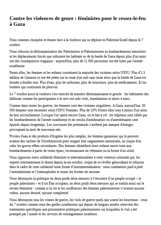 Nous opposons notre solidarité féministe et internationaliste à cette violence coloniale qui, les experts internationaux le disent depuis la mi-octobre, risque de se révéler génocidaire et refusons dans le cadre de cette solidarité toute forme d’instrumentalisation : nous combattons pied à pied l’antisémitisme et l’islamophobie et toutes les formes de racisme.