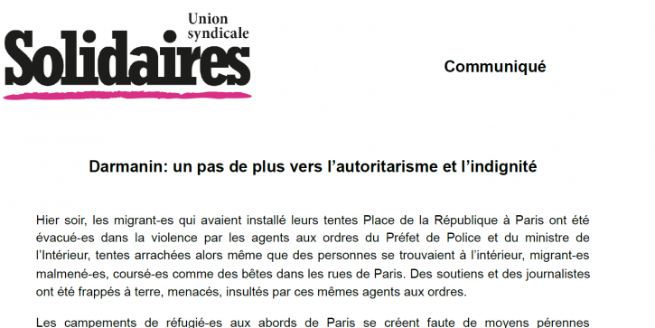 L’Union syndicale Solidaires dénonce et condamne fermement ces faits, qui ne font que confirmer un peu plus chaque jour l’inhumanité de la politique de ce gouvernement qui nie la situation dramatique des migrant-es et sans papier-es, qui s’enfonce dans la dérive autoritaire et la répression violente sciemment.