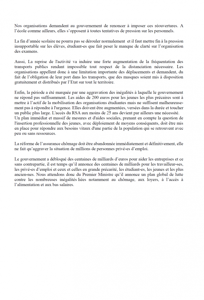 Le gouvernement a débloqué des centaines de milliards d’euros pour aider les entreprises et ce sans contrepartie, il est temps qu’il annonce des centaines de milliards pour les travailleur-ses, les privé-es d’emploi et ceux et celles en grande précarité, les étudiant-es, les jeunes et les plus ancien-nes. Nous attendons donc du Premier Ministre qu’il annonce un plan global de lutte contre les nombreuses inégalités liées notamment au chômage, aux loyers, à l’accès à l’alimentation et aux bas salaires.