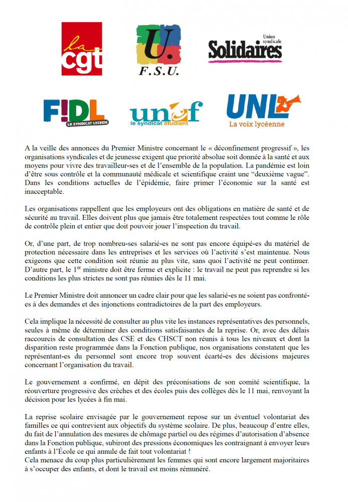A la veille des annonces du Premier Ministre concernant le « déconfinement progressif », les organisations syndicales et de jeunesse exigent que priorité absolue soit donnée à la santé et aux moyens pour vivre des travailleur-ses et de l’ensemble de la population. La pandémie est loin d’être sous contrôle et la communauté médicale et scientifique craint une “deuxième vague”. Dans les conditions actuelles de l’épidémie, faire primer l’économie sur la santé est inacceptable.