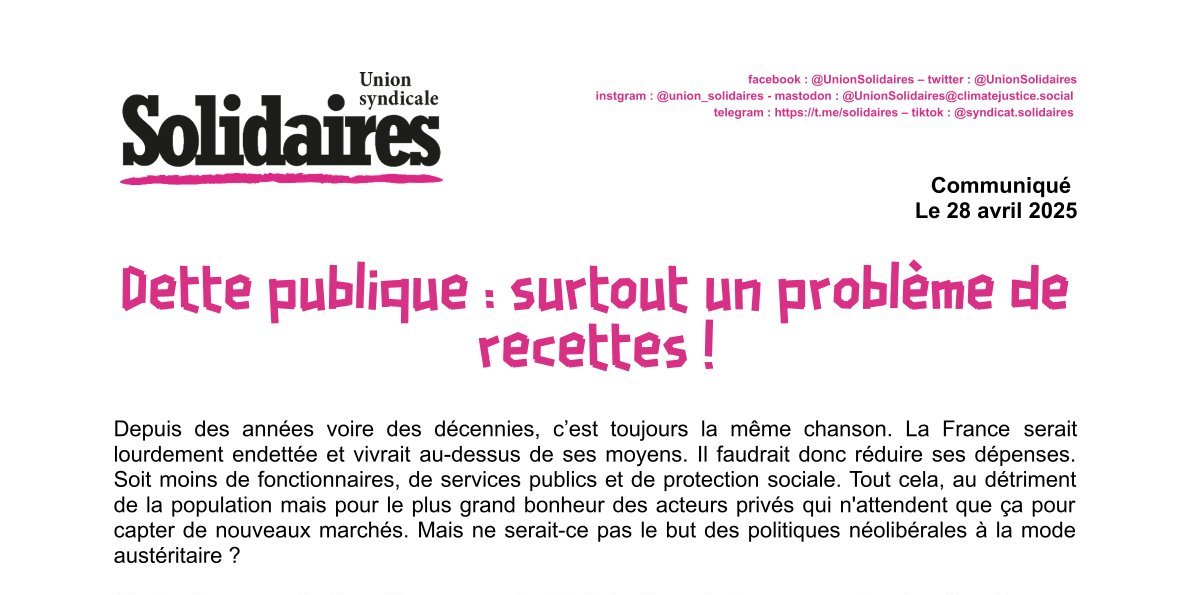 Pour l’Union syndicale Solidaires, les pistes de recettes sont donc nombreuses. Et ce sont elles qui doivent empruntées ! Elles passent par l’impôt et la justice fiscale, mais également par cesser les dépenses qui ne sont d’aucune utilité pour le bien commun. Solidaires revendique que la priorité des dépenses publiques, ce soient les services publics et la protection sociale. Sans compter que dépenser plus pour les services publics, c’est enfin lutter contre le désespoir social et l’extrême droite.