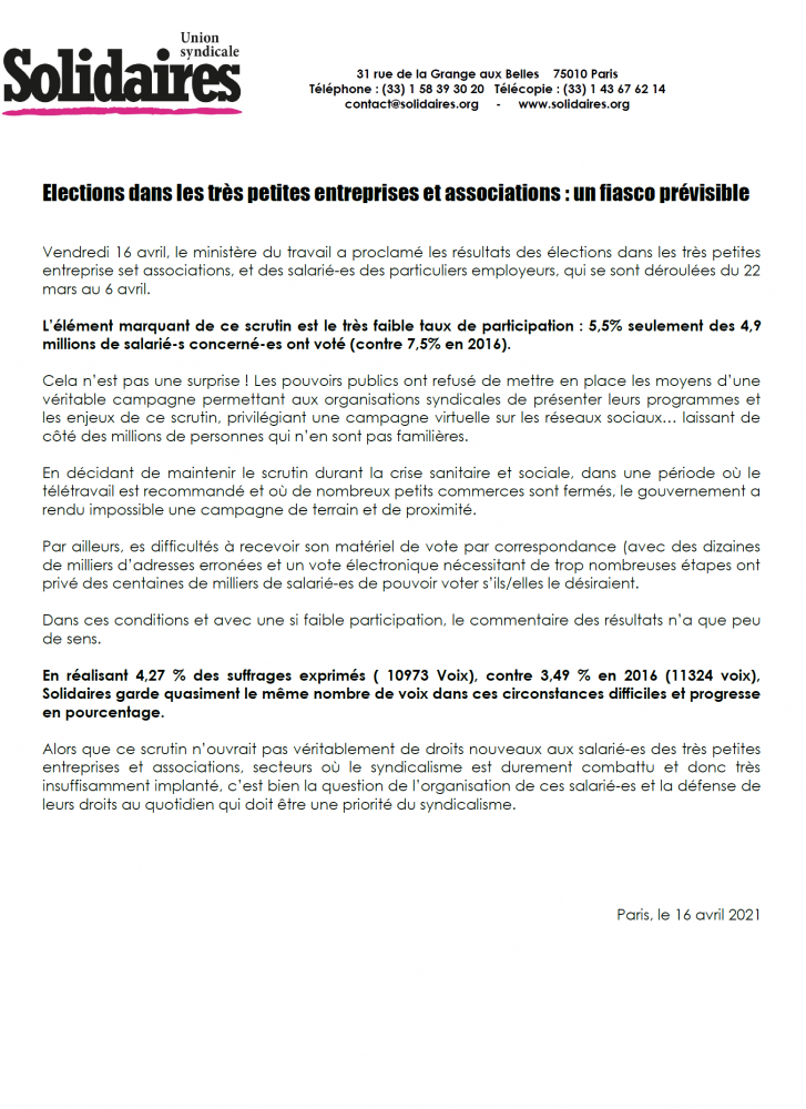 Vendredi 16 avril, le ministère du travail a proclamé les résultats des élections dans les très petites entreprises et associations, et des salarié-es des particuliers employeurs, qui se sont déroulées du 22mars au 6 avril.