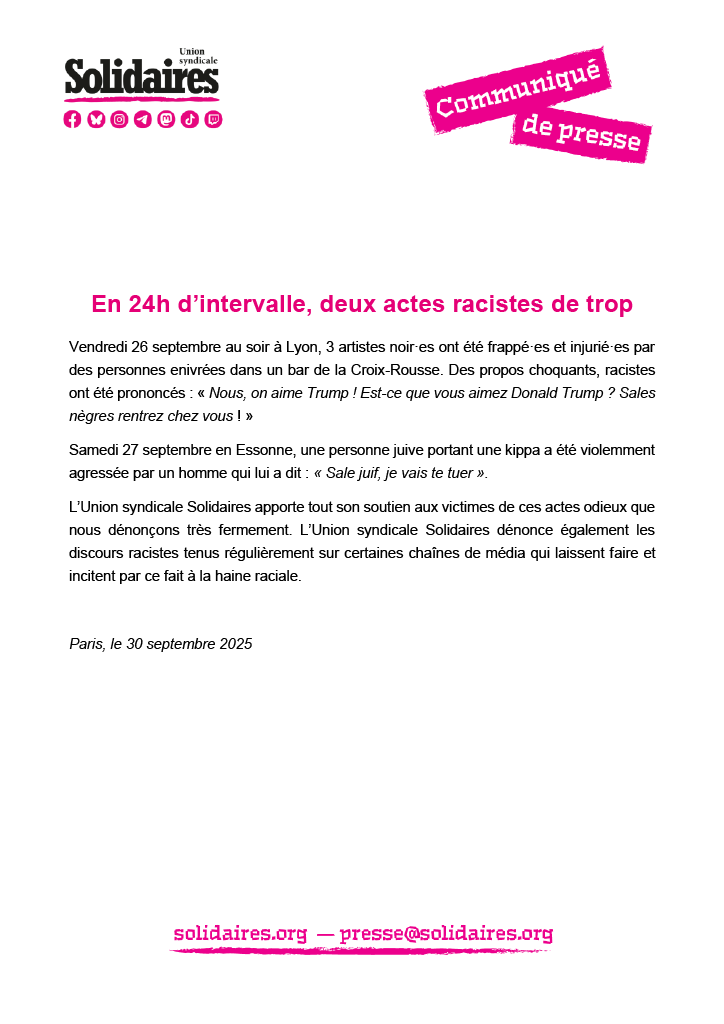 L’Union syndicale Solidaires apporte tout son soutien aux victimes de ces actes odieux que nous dénonçons très fermement. L’Union syndicale Solidaires dénonce également les discours racistes tenus régulièrement sur certaines chaînes de média qui laissent faire et incitent par ce fait à la haine raciale.