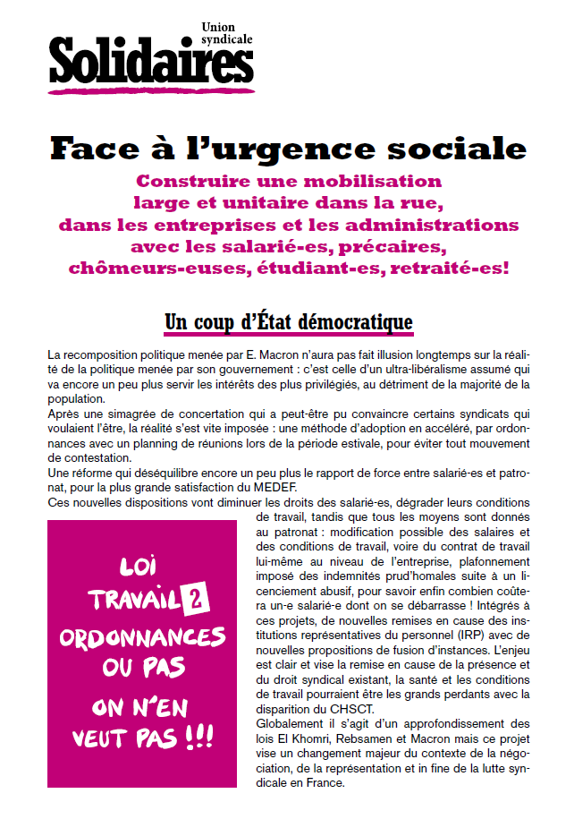 Tirant le bilan de la lutte sur la loi travail Solidaires travaillera à l'articulation entre les secteurs immédiatement concernés (dans le privé) et les autres (le public), y compris face à des d'attaques décalées dans le temps , Solidaires travaillera aussi à favoriser le travail en commun de toutes les équipes syndicales dans les cadres professionnels mais aussi interprofessionnels locaux, en particulier, articulant nos actions professionnelles avec des mobilisations type « nuits debout »ou dans des cadres comme « nos droits contre leurs privilèges, « front social », « on bloque tout » etc.