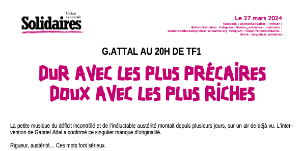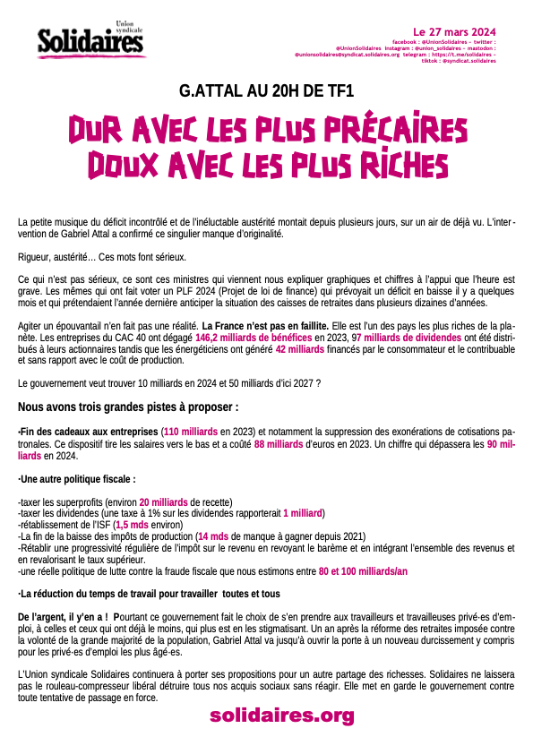 De l’argent, il y’en a ! Pourtant ce gouvernement fait le choix de s’en prendre aux travailleurs et travailleuses privé·es d’emploi, à celles et ceux qui ont déjà le moins, qui plus est en les stigmatisant. Un an après la réforme des retraites imposée contre la volonté de la grande majorité de la population, Gabriel Attal va jusqu’à ouvrir la porte à un nouveau durcissement y compris pour les privé·es d’emploi les plus âgé·es.