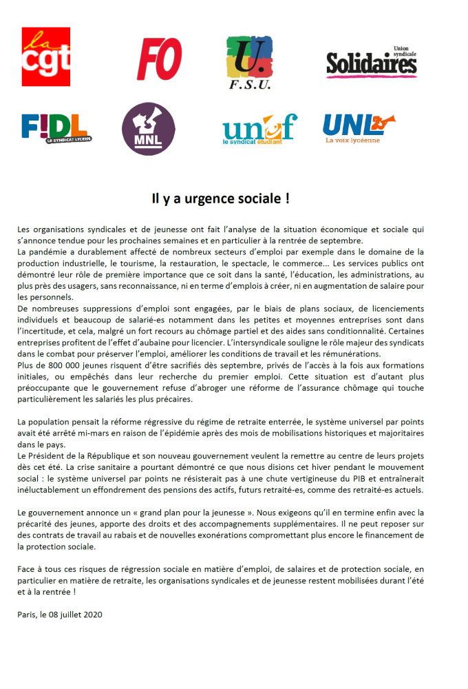 Face à tous ces risques de régression sociale en matière d’emploi, de salaires et de protection sociale, en particulier en matière de retraite, les organisations syndicales et de jeunesse restent mobilisées durant l’été et à la rentrée !