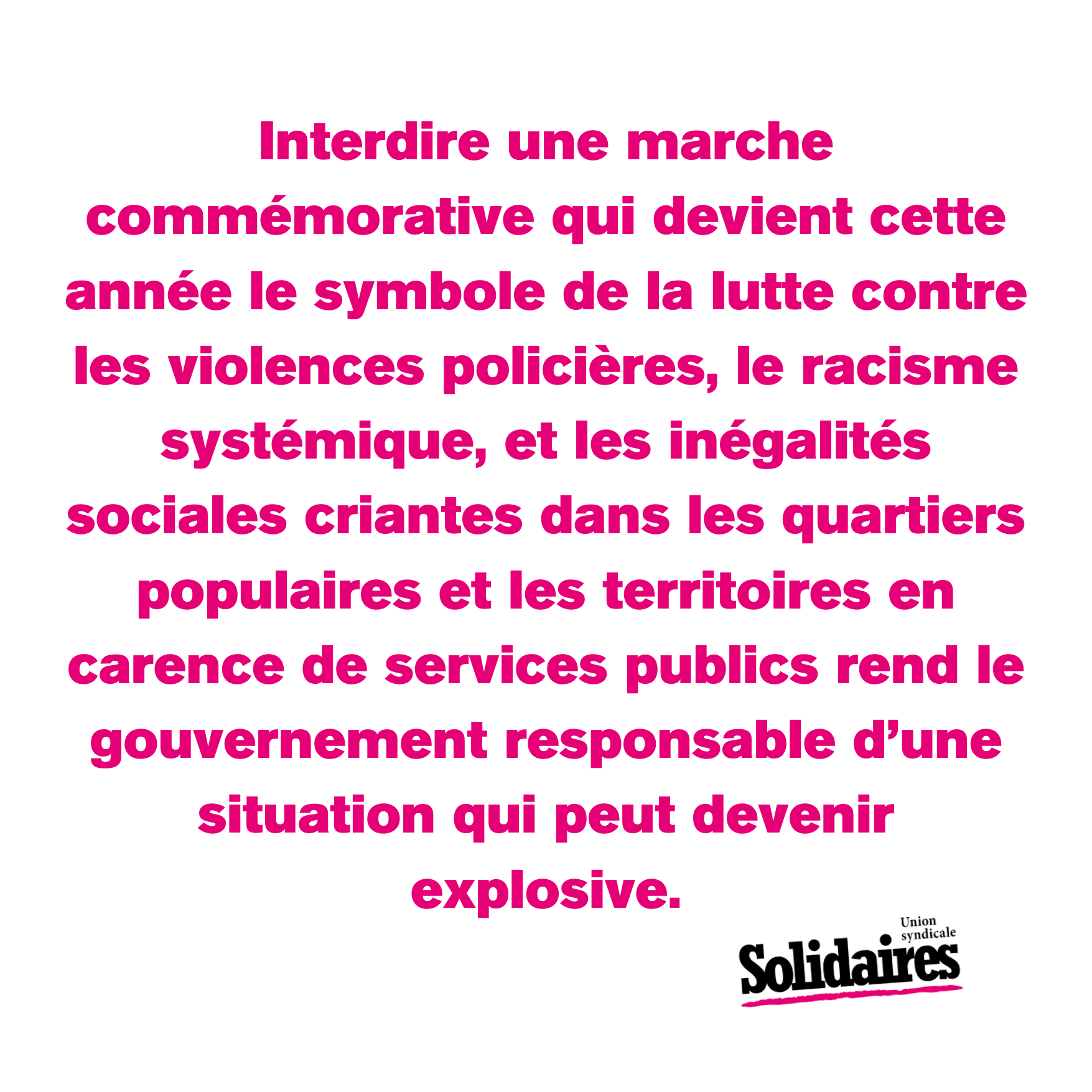 Interdire une marche commémorative qui devient cette année le symbole de la lutte contre les violences policières, le racisme systémique, et les inégalités sociales criantes dans les quartiers populaires et les territoires en carence de services publics rend le gouvernement responsable d’une situation qui peut devenir explosive.