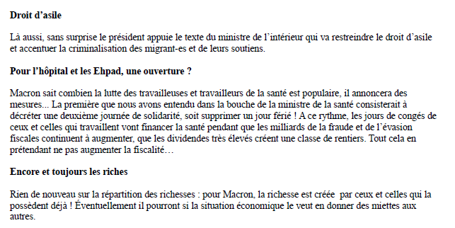 Macron sait combien la lutte des travailleuses et travailleurs de la santé est populaire, il annoncera des mesures... La première que nous avons entendu dans la bouche de la ministre de la santé consisterait à décréter une deuxième journée de solidarité, soit supprimer un jour férié ! A ce rythme, les jours de congés de ceux et celles qui travaillent vont financer la santé pendant que les milliards de la fraude et de l’évasion fiscales continuent à augmenter, que les dividendes très élevés créent une classe de rentiers. Tout cela en prétendant ne pas augmenter la fiscalité…