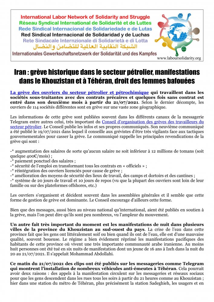 La grève des ouvriers du secteur pétrolier et pétrochimique qui travaillent dans les sociétés sous-traitantes avec des contrats précaires et quelques fois sans contrat est entré dans son deuxième mois à partir du 21/07/2021. Selon le dernier décompte, les ouvriers de 114 sociétés différentes sont en grève sur une vaste zone géographique.