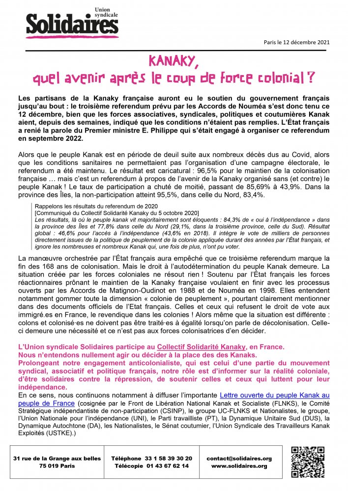 L’Union syndicale Solidaires participe au Collectif Solidarité Kanaky, en France.