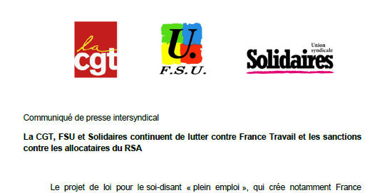 Le projet de loi pour le soi-disant « plein emploi », qui crée notamment France Travail, a été soumis au Conseil Constitutionnel par des député∙es de gauche. La CGT, FSU et Solidaires déposent une contribution volontaire au Conseil pour continuer de combattre cette attaque contre les personnes en situation de précarité, d’une violence inégalée, qui s’inscrit dans une suite de réformes toutes plus destructrices les unes que les autres pour leurs droits.