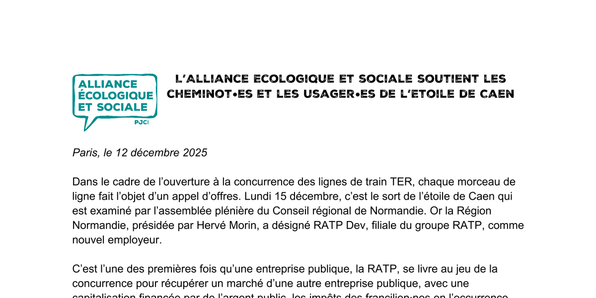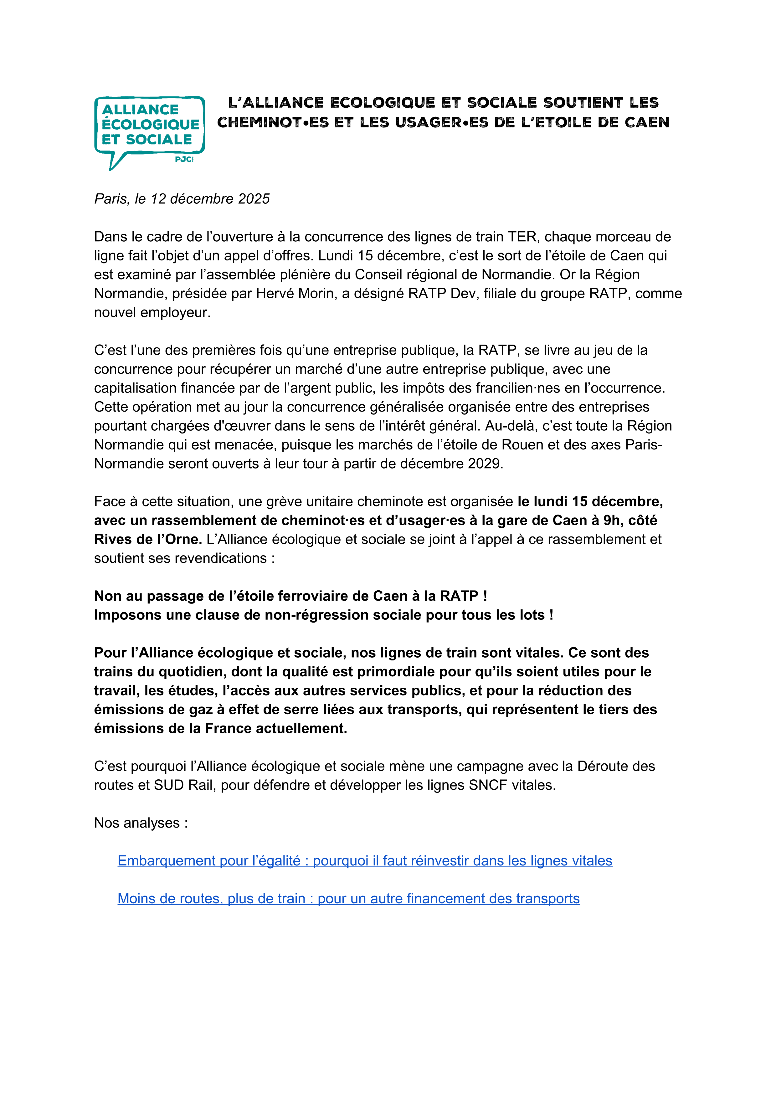 Face à cette situation, une grève unitaire cheminote est organisée le lundi 15 décembre, avec un rassemblement de cheminot∙es et d’usager∙es à la gare de Caen à 9h, côté Rives de l’Orne. L’Alliance écologique et sociale se joint à l’appel à ce rassemblement et soutient ses revendications :