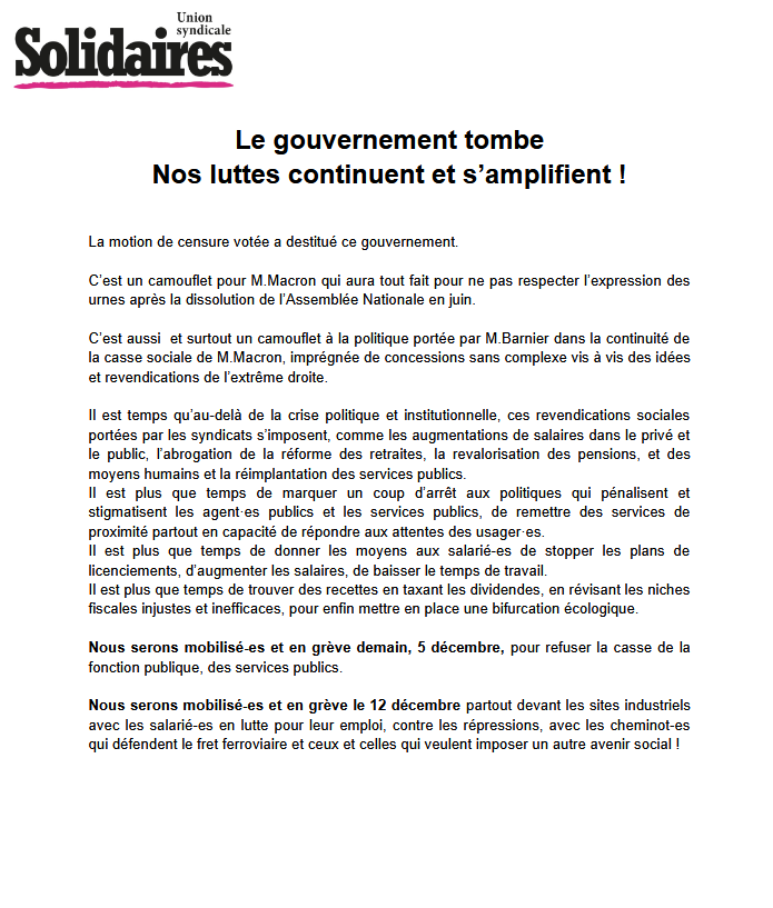 C’est aussi et surtout un camouflet à la politique portée par M.Barnier dans la continuité de la casse sociale de M.Macron, imprégnée de concessions sans complexe vis à vis des idées et revendications de l’extrême droite.
