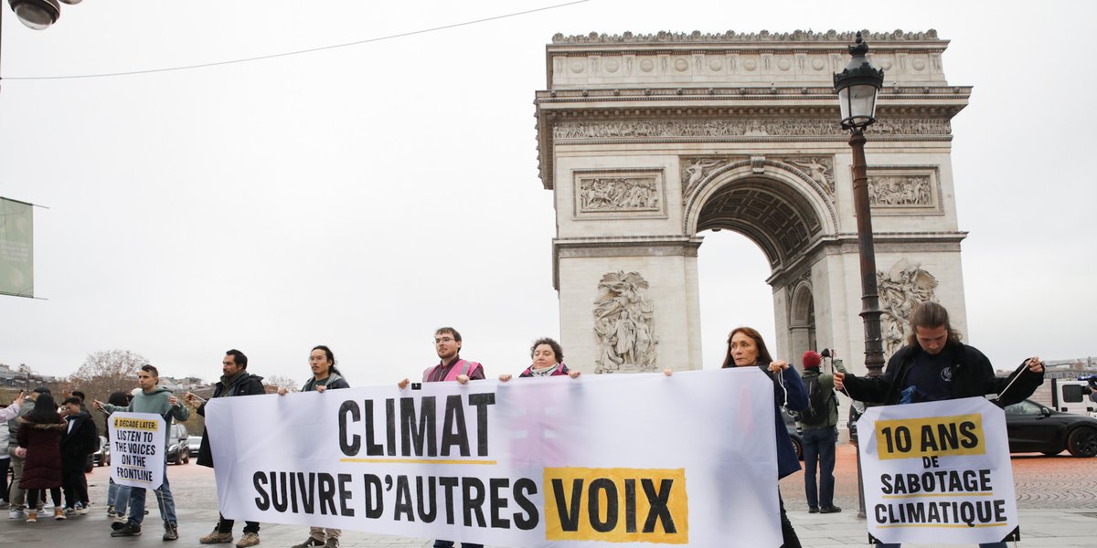 En ce dixième anniversaire de l’accord de Paris, des activistes d’Action non-violente COP21, d’Action Justice Climat et de Greenpeace France ont déversé ce matin de la peinture orange sur la Place Charles-de-Gaulle, anciennement place de l’Etoile, pour alerter sur l’invisibilisation persistante des populations les plus touchées par la crise climatique.