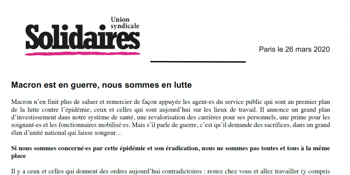 Macron n’en finit plus de saluer et remercier de façon appuyée les agent-es du service public qui sont au premier plan de la lutte contre l’épidémie, ceux et celles qui sont aujourd’hui sur les lieux de travail. Il annonce un grand plan d’investissement dans notre système de santé, une revalorisation des carrières pour ses personnels, une prime pour les soignant-es et les fonctionnaires mobilisé·es. Mais s’il parle de guerre, c’est qu’il demande des sacrifices, dans un grand élan d’unité national qui laisse songeur…
