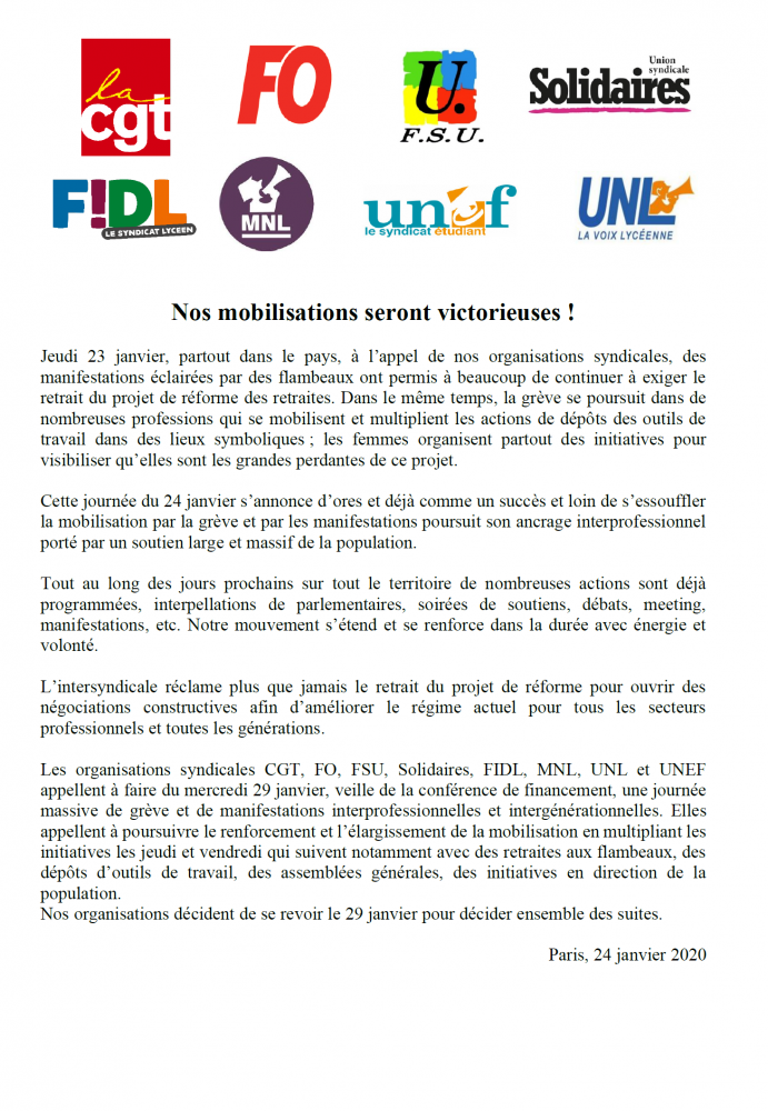 Cette journée du 24 janvier s’annonce d’ores et déjà comme un succès et loin de s’essouffler la mobilisation par la grève et par les manifestations poursuit son ancrage interprofessionnel porté par un soutien large et massif de la population.